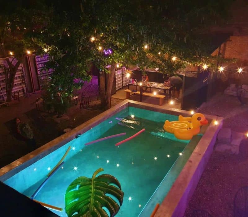 Ticuchi Hostel touts itself as “the only hostel with a pool.” Additional amenities include lounge areas, a bar, a fully equipped kitchen with shelves, and high-speed internet across all areas.
